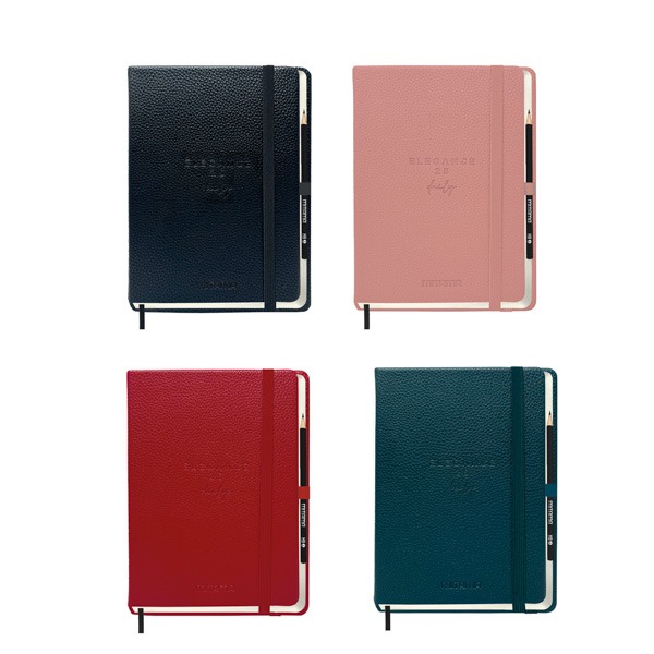 Caratteristiche: Agenda giornaliera. Copertina rigida. Bordo pagina colorato. Logo impresso. Accessori: 50 segnapagina colorati, Matita coordinata, tasca interna. Angoli arrotondati. Chiusura con elastico.