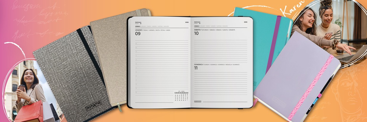 Caratteristiche: Agenda Bigiornaliera, Copertina rigida. Grafiche originali. Rilegatura in brossura. Angoli arrotondati. Chiusura con elastico. Elastico e segnapagine coordinati. Frontespizi personalizzati. Formato Tascabile.