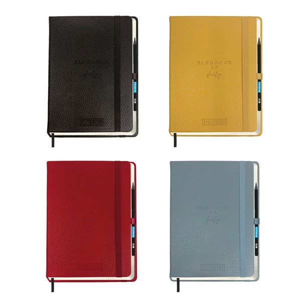 Frontespizio colorato. Chiusura con elastico. Angoli arrotondati. Accessori: 50 segnapagina fluo, matita