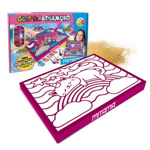 Con questo kit, puoi creare quadretti super luminosi utilizzando le tante polverine glitter e le gemme colorate incluse nella confezione! Rimuovi la pellicola, applica le gemme e infine aggiungi glitter nei colori che preferisci per completare la tua opera d’arte!