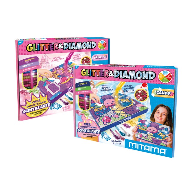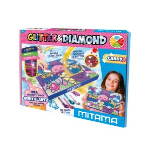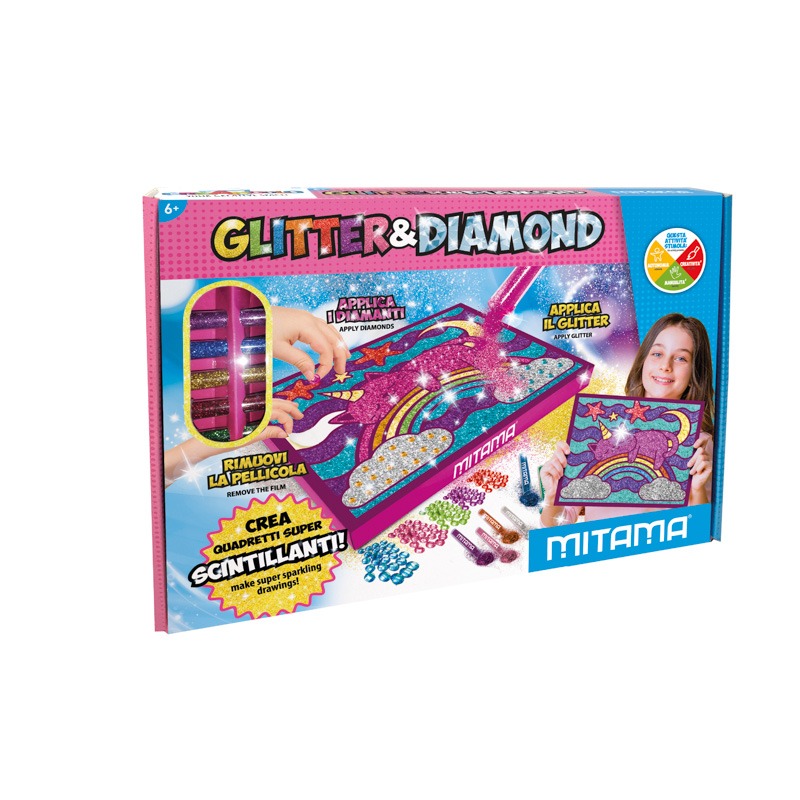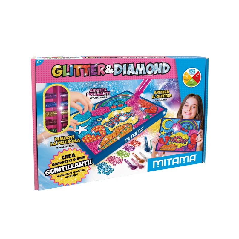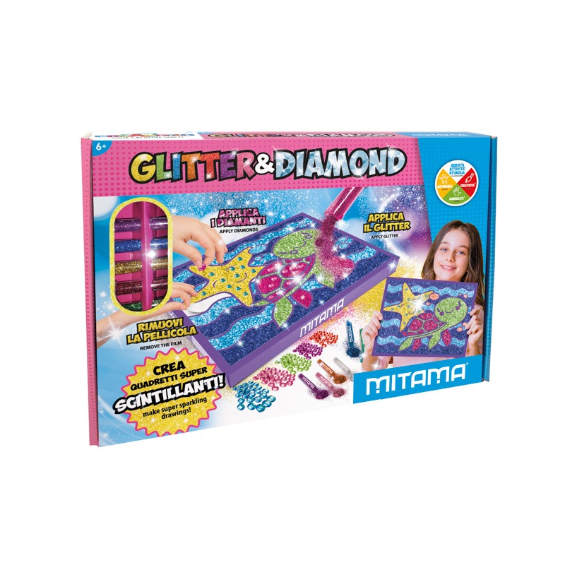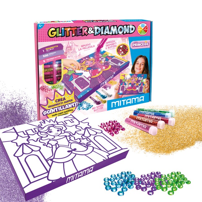 CONTENUTO 1 QUADRETTO 30×28 cm 500 DIAMANTI in 5 colorazioni 5 POLVERINE GLITTER (nuova formula bio-based) FASCIA DI ETA’ DIMENSIONI SCATOLA