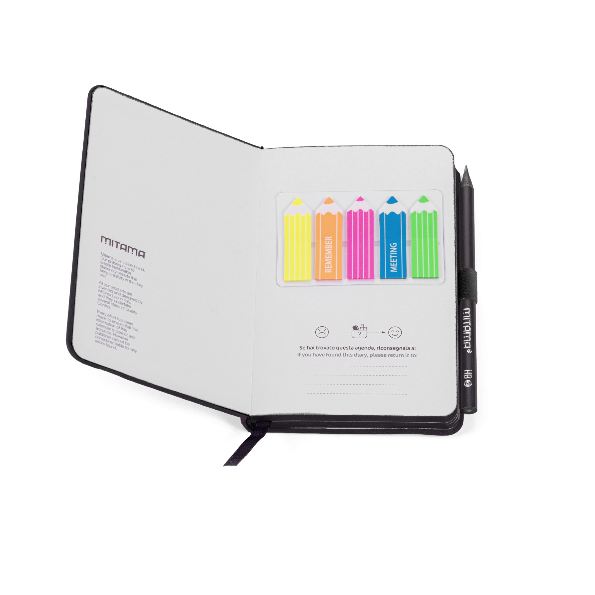 Materiale Soft Touch nero, Matita coordinata, segnapagina Fluo.
