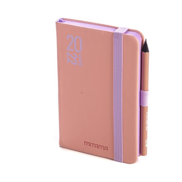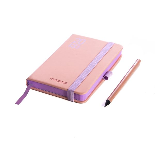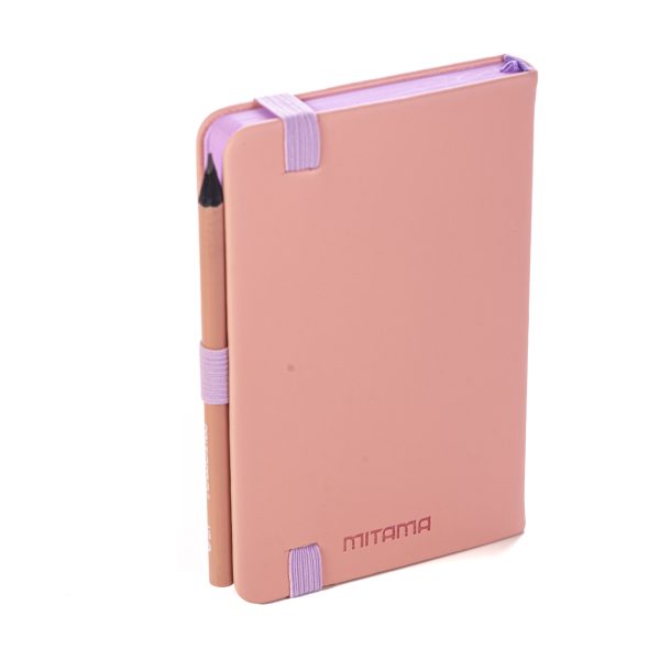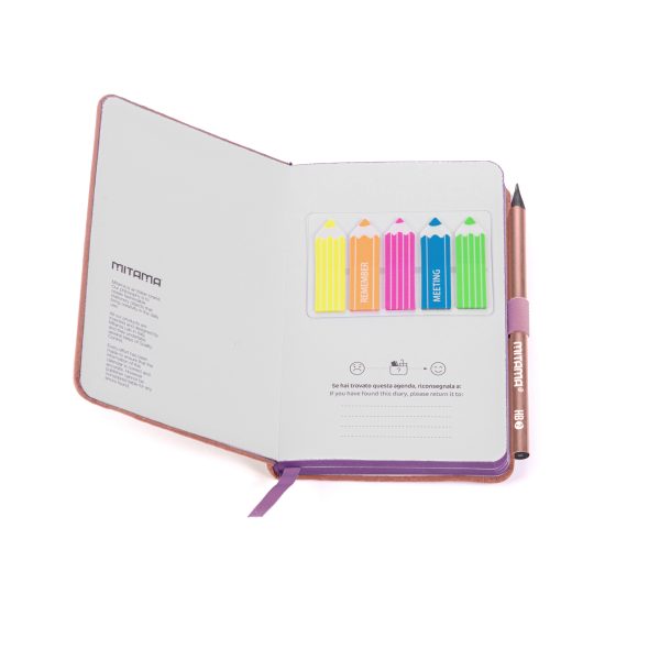 Materiale Soft Touch rosa, Matita coordinata, segnapagina Fluo.