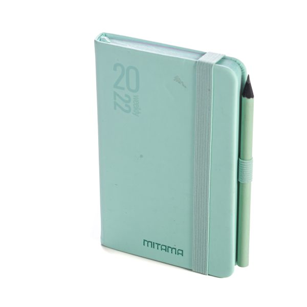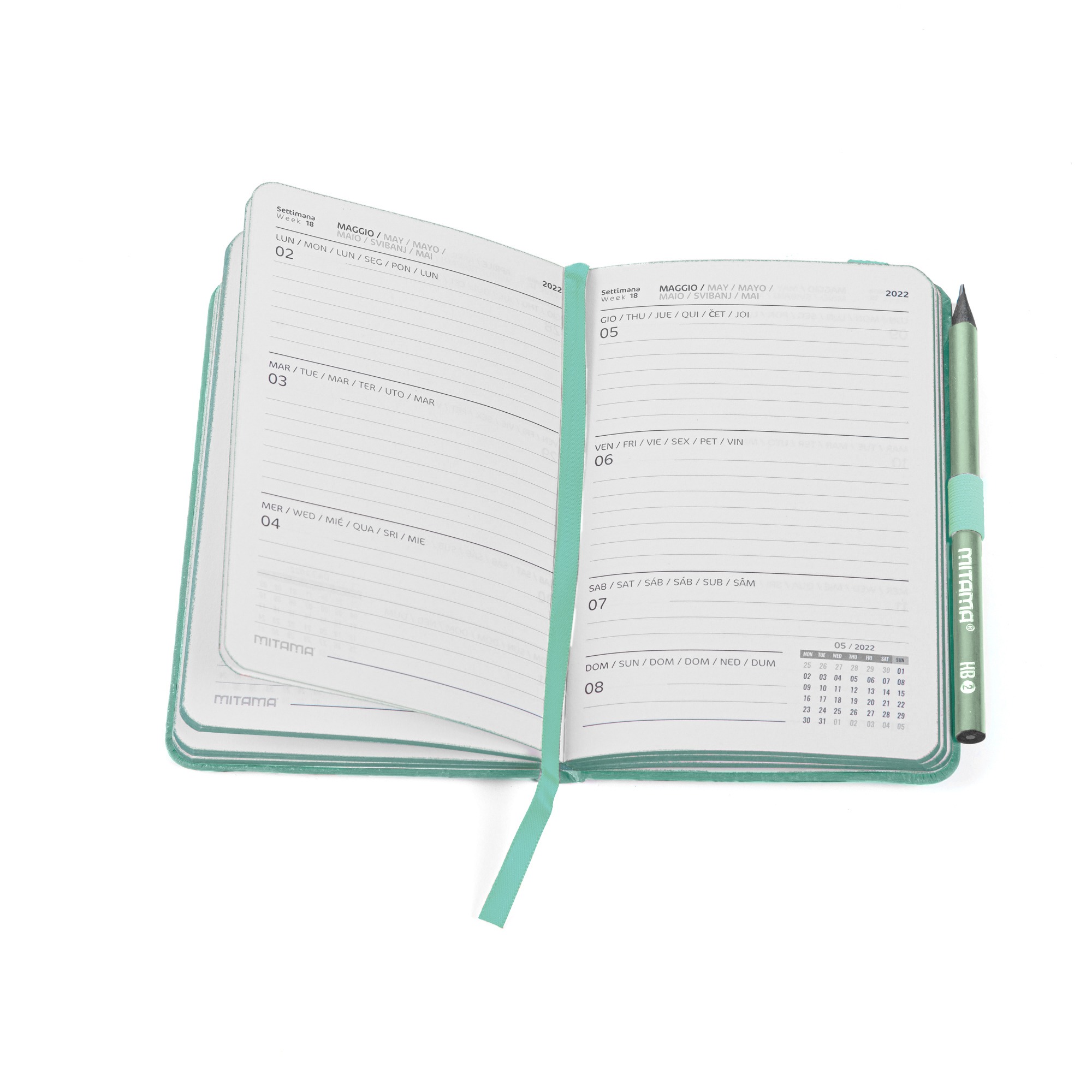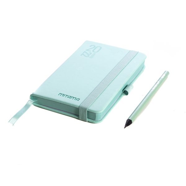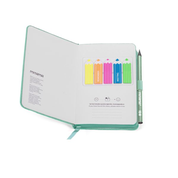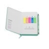 Materiale Soft Touch verde acqua, Matita coordinata, segnapagina Fluo.