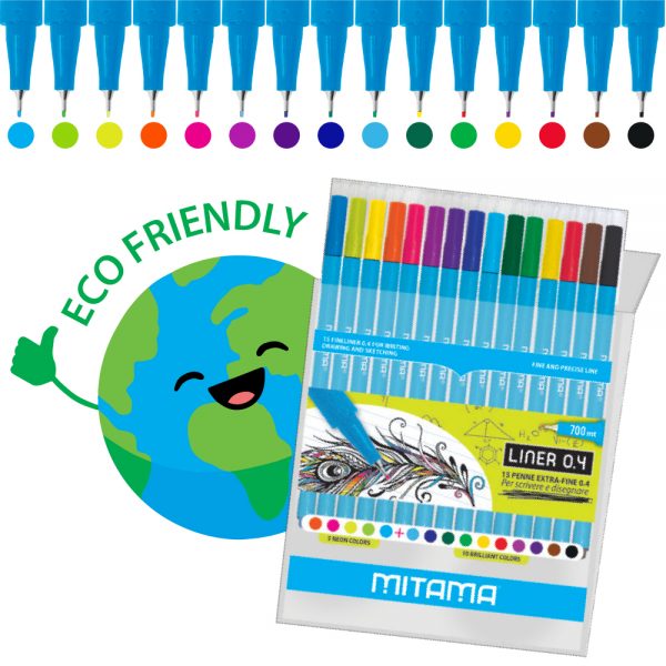 Le nuove Penne Liner 0.4 Mitama sono il nuovo modo di scrivere e prendere appunti in maniera precisa e colorata. Puoi anche usarle per disegnare. Ben 15 colori (5 neon e 10 brillanti) contenuti in una pratica confezione trasparente e riutilizzabile.