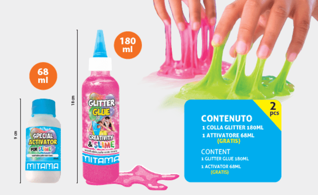 Arriva il nuovo prodotto Mitama Slime! Pronti per divertirsi creando come vuoi tu il tuo elasticoso, melmoso, appiccicoso Slime? Con l’attivatore in omaggio puoi decidere tu che consistenza dare alla tua colla slime: non serviranno altre sostanze quali saponi, bicarbonato, ecc. hai tutto quello che serve in due pratiche bottigliette.