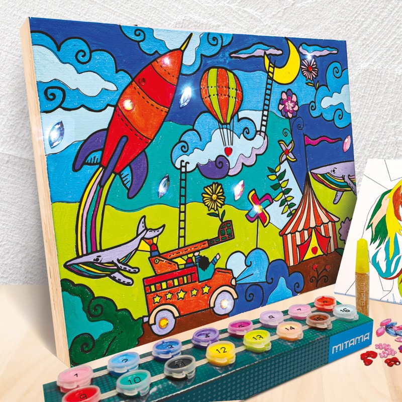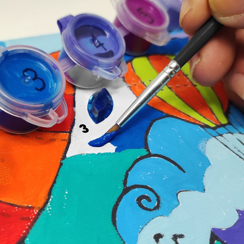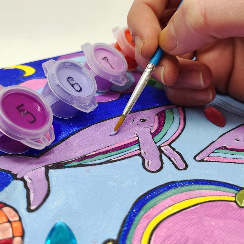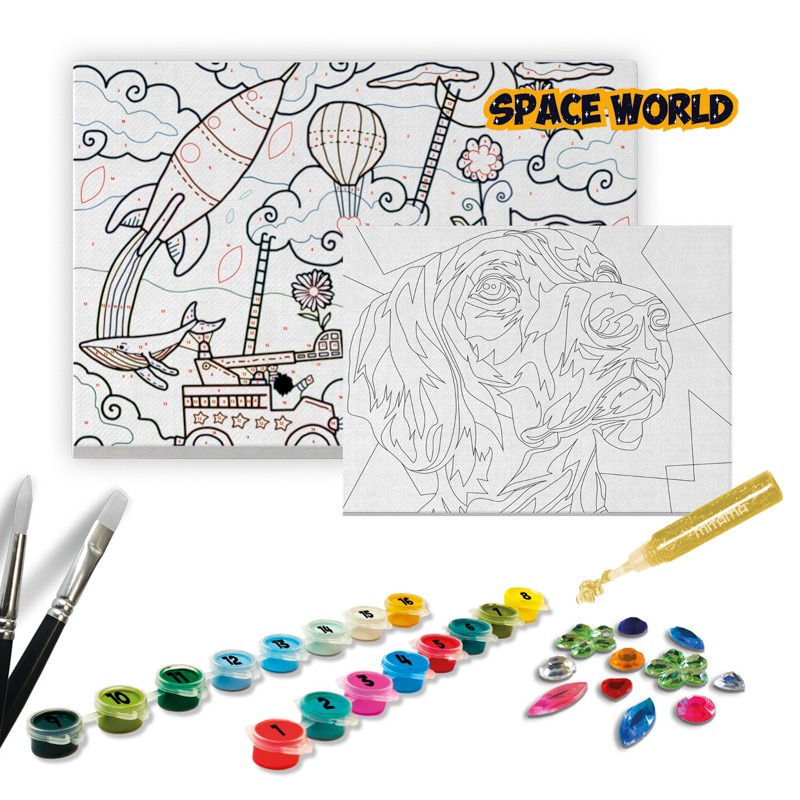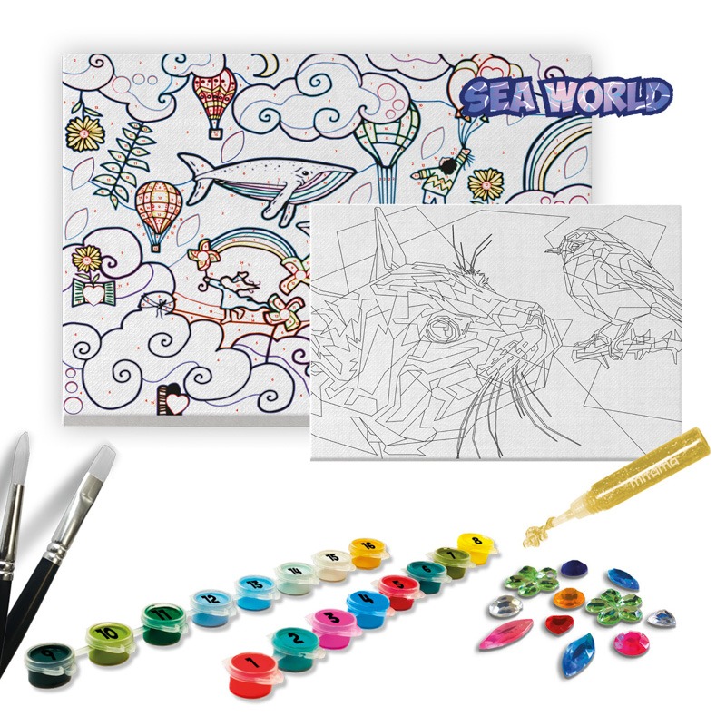 Con la tela a colori liberi dai libero sfogo alla tua fantasia, con la tela Paint by Number invece sfida la tua concentrazione e manualità! Completa infine le tue creazioni rendendole uniche e brillanti grazie alla colla glitter e alle gemme colorate.